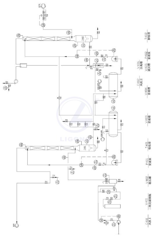 吸收C02氣體后的富液由吸收塔底部排出至富液槽,富液經(jīng)富液泵送至解吸塔上部,與解吸空氣在塔內(nèi)逆向接觸。富液中二氧化碳被解吸出來,解吸出氣體由塔頂排出放空,解吸后的貧液由解吸塔下部排入貧液槽。貧液經(jīng)貧液泵送至吸收塔上部循環(huán)使用,繼續(xù)進(jìn)行二氧化碳?xì)怏w吸收操作。