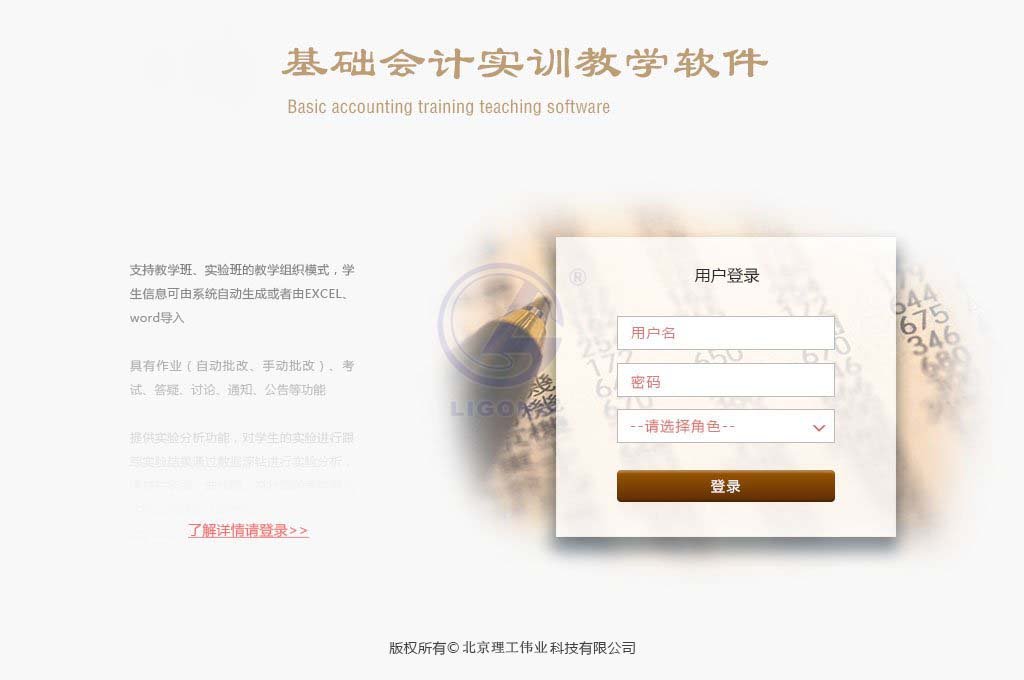 2.教師端模塊:班級管理、實驗管理、開設實驗、成績統計、實驗分析、課程管理、任務管理、習題管理、虛擬企業、會計制度文件、單據樣式查詢、實訓難度控制、網站薈萃、通知公告、密碼修改。