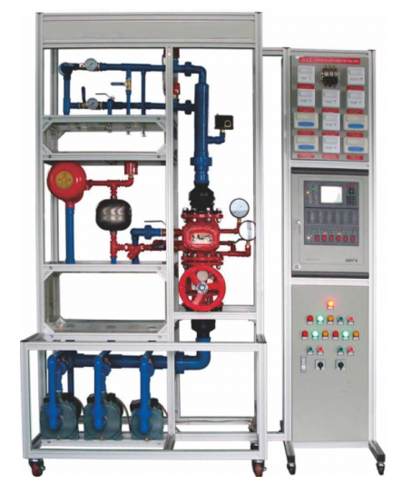 本裝置采用高級鋁型材框架開放式結構設計,主要由濕式報警閥、信號閘閥、水力警鈴、水延遲器、各類噴淋頭、增壓泵、恒壓泵、壓力開關、水流指示器、壓力表、末端試水裝置、透明有機玻璃水箱、水泵控制箱、火災報警控制器、聯動控制模塊、基于BACnet總線網絡的DDC控制器、手閥及各類水管等組成。