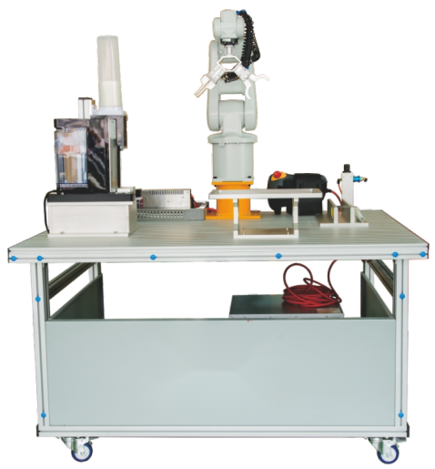 本裝置按照工業標準制造,符合自動化技術要求,能完成機器人取杯、接水(接咖啡)、取茶包、泡茶、加糖一系列動作。為保證教學安全,桌面配置有急停按鈕,防止人員意外接近運動中的機器人而造成意外傷害,既可保證教學和展示過程中的透明,可近距離觀察設備運行又保證人員安全,為教學和展示安全做出保障。