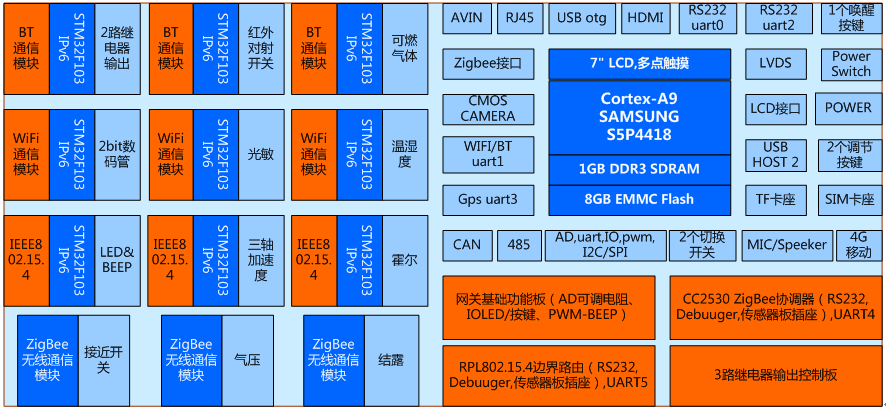1)能夠滿足單片機接口及應用、傳感器接口及應用、無線傳感網、嵌入式操作系統開發、嵌入式Linux應用開發、Android移動應用開發等課程要求。 2)能夠組建藍牙、WiFi、IEEE802.15.4、ZigBee四種無線網絡,實現數據的無線傳輸; 3)能夠將藍牙、WiFi、IEEE802.15.4無線網絡經IPV6協議、Zigbee節點經ZStack協議融合在一個拓撲圖中,在界面上顯示藍牙、WiFi、RPL802.15.4、ZigBee等節點的傳感器數據或執行器狀態,并實時流動地顯示各個傳感器數據的上、下行走向; 4)要求藍牙、WiFi、IEEE802.15.4三種傳感器節點均具有唯一的IPv6地址,統一采用IPv6協議組包通信。 5)要求網關支持Linux、Android雙操作系統,支持一鍵燒寫、一鍵切換。 6)要求在保證網關接入互聯網的前提下,能夠配置接入云服務平臺,并實現移動端傳感器數據的采集顯示和執行器的遠程控制。 二、硬件資源 1.Cortex-A9網關(1個) 1)核心板資源: (1)CPU:Cortex-A9四核心的Samsung s5p4418,主頻1.4GHz; (2)GPU:MAIL-400,3D圖形加速 (3)內存: 1GB DDR3; (4)EMMC: 8GB; (5)核心板+底板設計:核心板加裝屏蔽罩,郵票孔方式與底板連接,抗干擾能力更強,比插針式更穩定可靠。要求引出核心板信號線,不少于188PIN。 2)網關主板資源: (1)LCD接口:7寸IPS電容屏(16:9),分辨率1024×600; (2)USB接口:2路USB_HOST 2.0輸出,1路USB OTG; (3)Ethernet接口:核心板內置千兆IP,外加不超過3RMB的PHY芯片即可,支持10/100/1000M,RJ45接口; (4) 串口:2路3線RS232,1路TTL接口,1路RS485,1路Bluetooth; (5)CAN總線接口:1路; (6)RS485總線接口:1路; (7)HDMI 接口:HDMI1.4a,*大支持1920*1080高清數字輸出; (8)LVDS液晶屏接口:單通道,*大支持1920*1080; (9)攝像頭接口:1路CMOS并行接口,*大支持800萬像素; (10)AV接口:1路模擬視頻母口輸入; (11)外部存儲擴展接口:SD卡、TF卡接口; (12)音頻接口: 1路MIC輸入,1路1. 8w喇叭; (13)按鍵:1個復位按鍵、1個休眠喚醒按鍵,2個音量鍵; (14) 藍牙WiFi:板載藍牙WiFi二合一模塊; (15)Mini PCIe接口:標準可插入4G通信模模塊; (16)24Pins應用擴展接口:用于處理器外設接口擴展功能,包含3路串口、1路PWM、1路IIC、1路ADC、8個GPIO,5V電源。 2.網關IO基礎擴展板(1個) 由網關直接驅動。采用HC595串入并出特點,使用較少IO擴展更多功能,默認地址0x01。1路可調電位器模擬AD采樣通道,1路PWM驅動的蜂鳴器,5個觸摸按鍵,5個LED指示燈。 3.三路繼電器擴展板(1個) 由網關直接驅動。采用HC595串入并出特點,使用較少IO擴展更多功能,默認地址0x10。 可控制3路繼電器,線圈機械式觸點,1個常開,1個常閉,*大負載10A/277V AC。 4. ZigBee協調器(1個) 與網關的TTL UART連接。采用CC2530單片機外設接口、射頻通信與ZStack協議棧的方案,具備Zigbee建網功能,具有2個組網狀態及無線傳輸指示燈,2個功能按鍵,提供傳感器模塊接口、RS232接口、調試下載接口。 5. IEEE802.15.4主機(1個) 與網關的TTL UART連接。采用CC2530射頻功能與802.15.4的從機組建射頻網絡,接收從機信息,向從機發送命令。具有2個組網狀態及無線傳輸指示燈,2個功能按鍵,提供傳感器模塊接口、RS232接口、調試下載接口。 6.無線傳感網通信節點(12個) 1)微控制器主板硬件資源 (1)Cortex-M3核心主板(9個) 處理器基于ARM Cortex-M3核心的STM32F103,*高主頻72Mhz,內部Flash 256KB,RAM 48KB。 具有1個0.96寸OLED屏,能夠顯示MAC地址、上下級關系、傳感器數據、網絡信息等。 具有4個組網狀態及無線傳輸指示燈,2個功能按鍵、1個JTAG調試接口、1個24PIN的無線射頻接口,1組20*2PIN傳感器接口; 標配ARM仿真器、串口下載仿真調試轉接板。 運行IPv6協議棧實現無線通信的功能。 (2)CC2530核心主板(3個) 處理器基于CC2530F256,具有2個組網狀態及無線傳輸指示燈,2個功能按鍵、1個JTAG調試接口、1個24PIN的無線射頻接口,1組20*2PIN傳感器接口; 標配下載仿真器。 2)無線傳感網通信模塊 (1)藍牙通信模塊(3個):采用UART接口的內置協議棧方案,設置從機模式,與主機配對后,將微控制器采樣數據傳輸給主機。 (2)WiFi通信模塊(3個):采用UART接口的內置TCP/UDP/HTTP協議棧方案,支持設置為AP、STA的工作模式,與網關通信后,將微控制器采樣數據傳送給主機,或者接收主機的控制命令控制執行器。 (3)IEEE802.15.4通信模塊(3個):基于CC2530射頻組網通信方案,與邊界路由器組網,實現傳感器數據的雙向交互。 (4)ZigBee通信模塊(3個):基于CC2530+ZStack協議棧組網通信方案,與Zigbee協調器組網,實現傳感器數據的雙向交互。 3)傳感器通信模塊(12個) 接口至少包含GPIO/IIC/SPI/PWM/電源/地等信號。 兼容紅外接近開關、可燃氣體傳感器、繼電器控制、雙位數碼管顯示、溫濕度傳感器、光敏傳感器、LEDBEEP聲光執行器、霍爾傳感器、三軸加速度傳感器、紅外對射傳感器、數字氣壓傳感器、凝露傳感器等??芍苯咏拥街靼鍌鞲衅鹘涌诎迳?,提供各類傳感器接口板的原理圖和技術手冊。 三、軟件資源 1.嵌入式操作系統: 網關處理器支持Linux3.4、Android4.4、QT4.8或更高版本,節點支持Contiki2.7、Z-Stack2007,提供板載所有硬件接口及應用模塊的驅動和應用測試,開放源碼。 2. 網關操作系統燒寫: 提供Windows下一鍵刷機軟件,選擇需要更新的鏡像文件,可通過SD卡脫離PC機一鍵燒寫,也可通過USB線纜刷機,支持Uboot參數修改配置。系統支持一鍵燒寫雙系統Android和Linux,可一鍵切換。 3.支持嵌入式開發所必須的功能: 4G語音通話、短信、上網,音頻錄放音功能,WIFI(支持AP熱點)、Ethernet上網功能,無線藍牙功能,模擬/數字攝像頭拍照、錄像功能,模