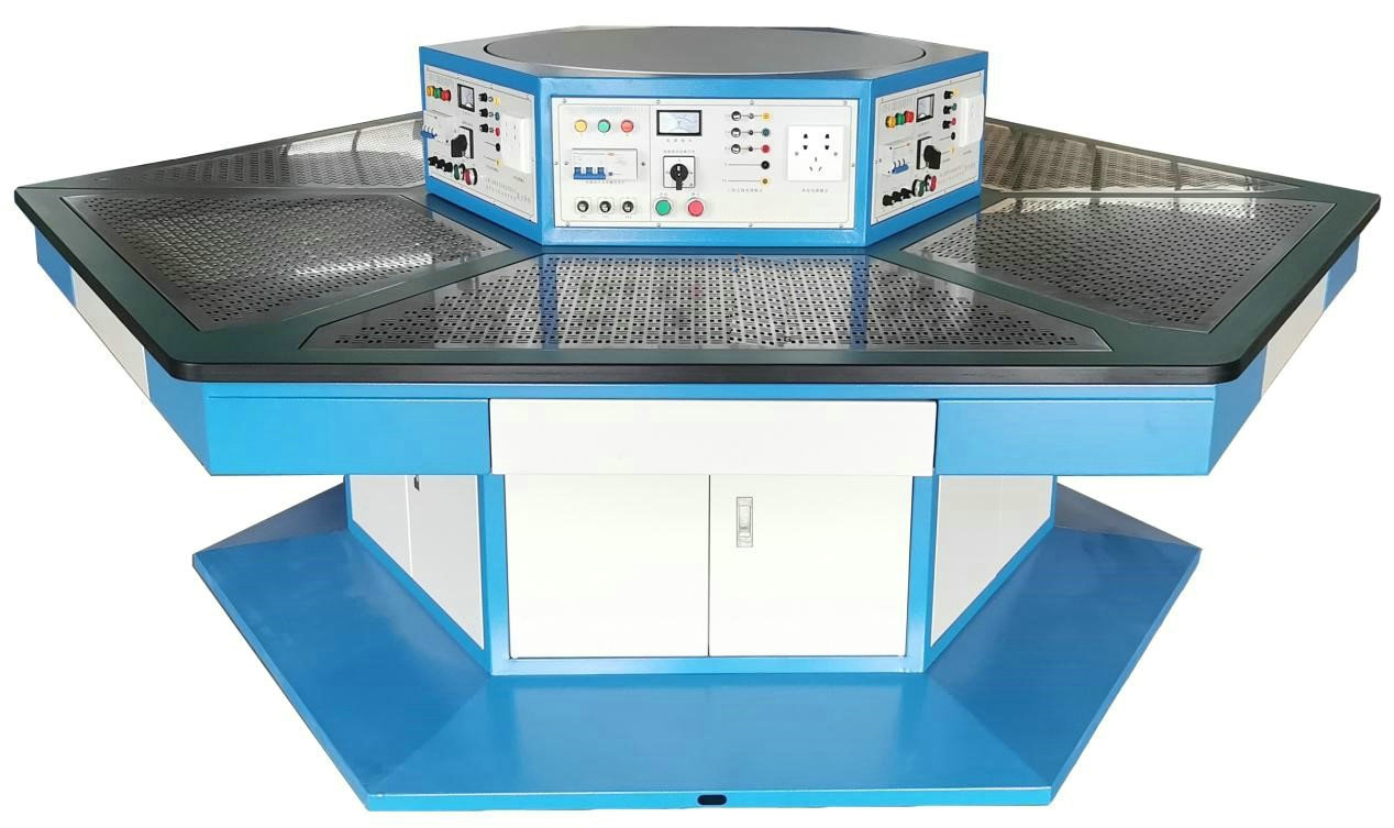 2、六邊形電源控制屏:電源控制屏采用六邊形結(jié)構(gòu),與工作臺相對應(yīng)。框架采用優(yōu)質(zhì)鞍鋼盒裝鋼板,經(jīng)過機械加工成型,外表面噴涂彩色環(huán)氧聚塑。六個作業(yè)面配置有實訓(xùn)電源及主機控制系統(tǒng),控制面板具有漏電保護、短路保護功能。電源控制屏頂面采用10mm厚的鋁框包邊,內(nèi)置有直徑為850mm的多角度公共操作平臺,公共操作平臺能360°旋轉(zhuǎn),能做120°定位,平臺頂板采用10mm厚的鋁板加工成型,能載重約60Kg的典型工作任務(wù)。