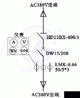 4、低壓電器實訓柜包含兩個部分,實訓柜的正面為典型的低壓進線開關柜電路,主結線如下圖示: