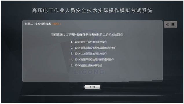 觸摸答題完成后,系統(tǒng)提示考生進行實際操作。每個安全操作技術(shù)題均有對應(yīng)仿真實物實際操作,系統(tǒng)根據(jù)考生的操作智能評分,實現(xiàn)對實際操作的自動化考核。